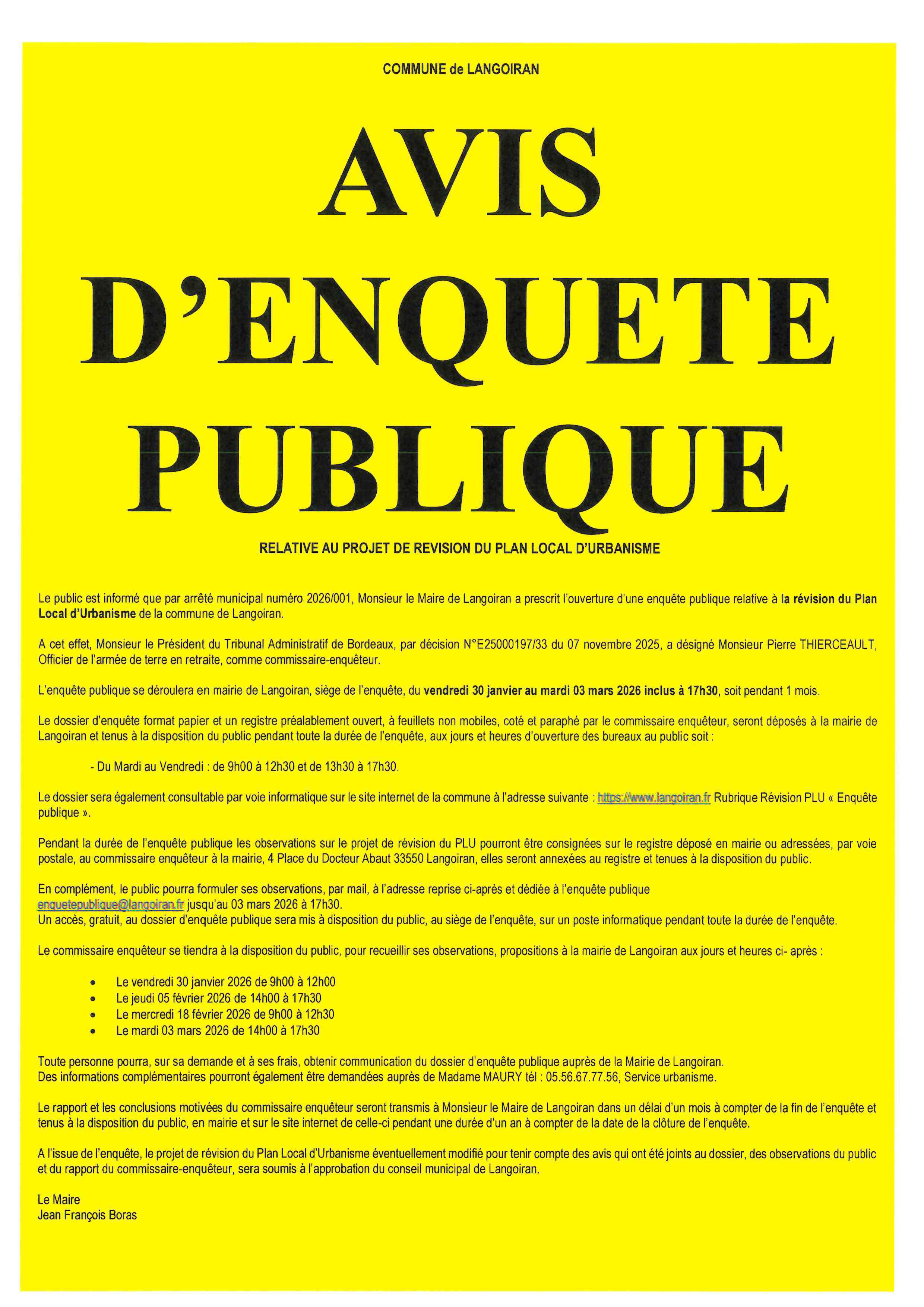 L'enquête publique de la révision du PLU, aura lieu du vendredi 30 janvier 2026 à 9h00 au mardi 03 mars 2026 à 17h30.