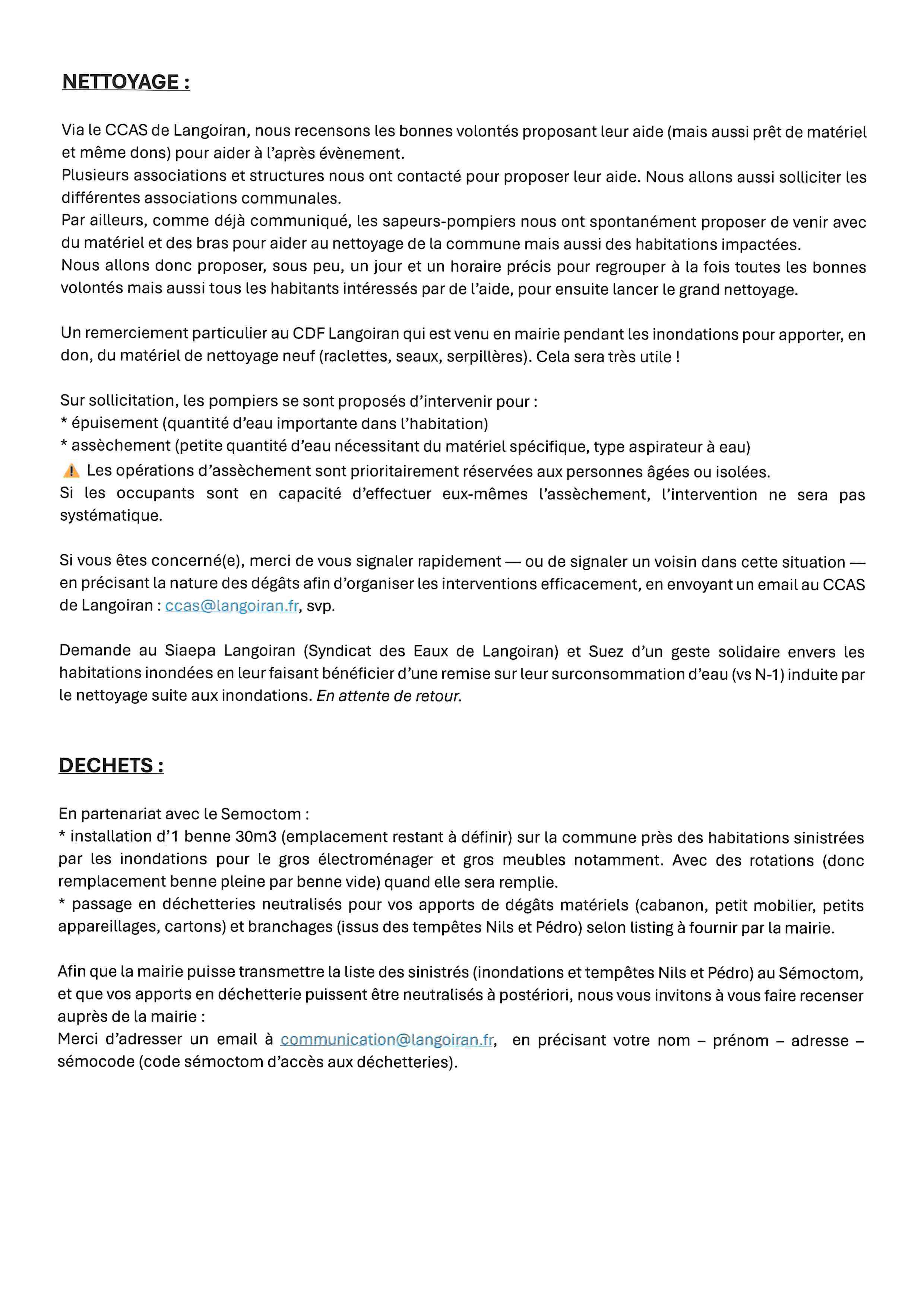 Suite aux épisodes de tempête et d'inondations ayant touché notre commune, un dispositif exceptionnel d'accompagnement des sinistrés a été mis en place par esprit de solidarité. Ce dispositif a permis de faciliter la gestion des déchets après sinistre, grâce à :