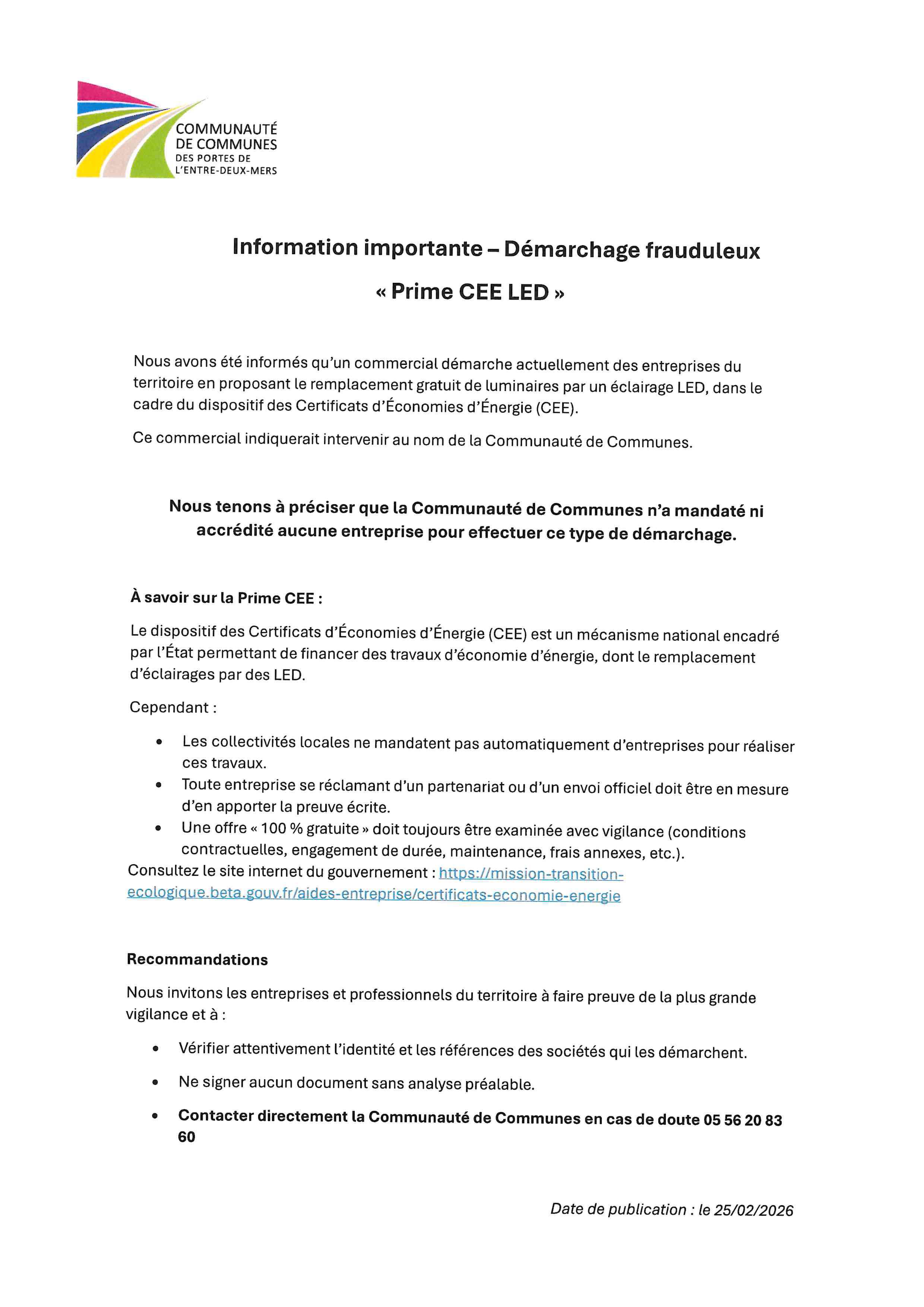La Communauté de Communes des Portes de l'Entre Deux Mers nous informe qu'un commercial démarche actuellement des entreprises du territoire en proposant le remplacement gratuit de luminaires par un éclairage LED, dans le cadre du dispositif des Certificats d'Economies d'Energie (CEE). Ce commercial indiquerait intervenir au nom de la CDC des Portes de l'Entre Deux Mers.