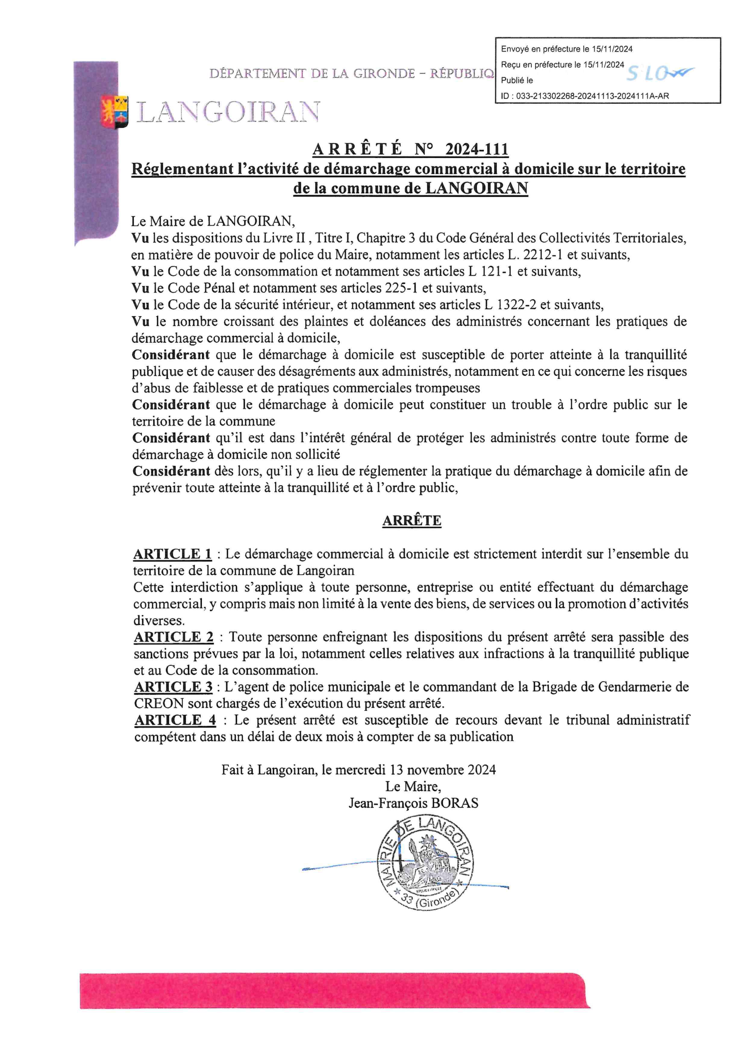 De plus, nous vous rappelons que le démarchage commercial sur la commune de Langoiran, est interdit par arrêté n° 2024-111 du 13 novembre 2024.